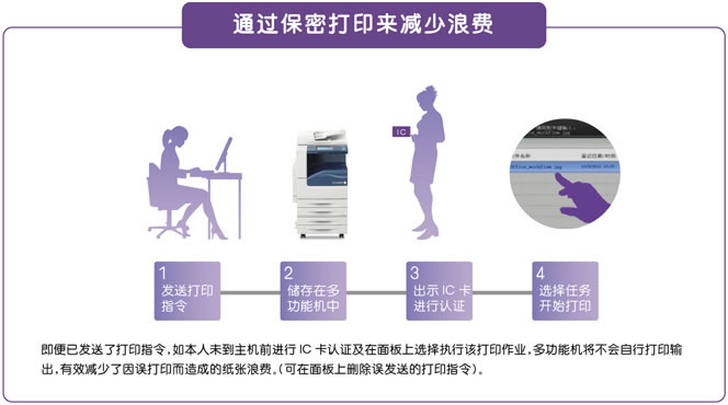 只有經(jīng)IC卡讀卡器認(rèn)證的IC卡用戶才能在多功能設(shè)備的操作面板上查看他們的文件,并釋放打印作業(yè)。然后他們可以當(dāng)場取走文件。打印機(jī)上將再也不會有無人照管的文件!