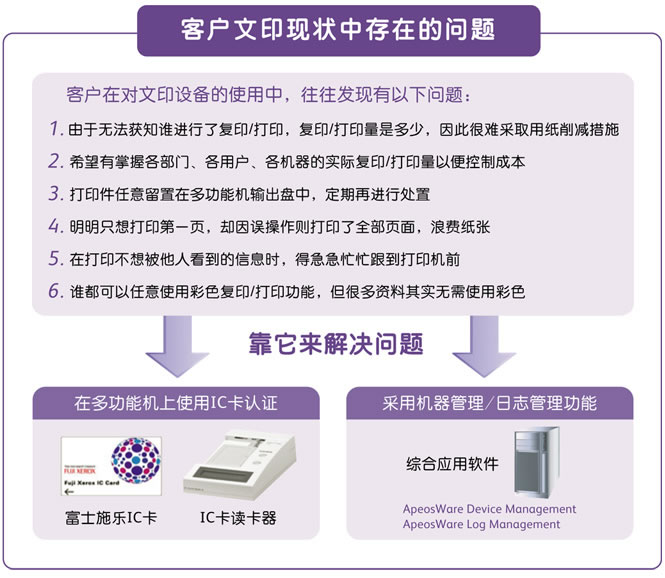 我們來為大家介紹一下IC卡刷卡打印方案和軟件。客戶公司員工經(jīng)常把文件遺忘在多功能數(shù)碼機(jī)或打印機(jī)上造成信息泄露。員工經(jīng)常使用多功能機(jī)打印彩色照片或小說等大量與工作無關(guān)的文件。