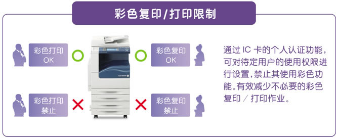 可以設(shè)置限制,從而只有使用IC卡認(rèn)證的用戶才能夠使用該多功能設(shè)備。能夠防止信息泄露給那些未經(jīng)認(rèn)證的無IC卡用戶。此外,也可以對單個功能進(jìn)行限制,例如復(fù)印、打印、傳真、掃描、彩色或黑白。