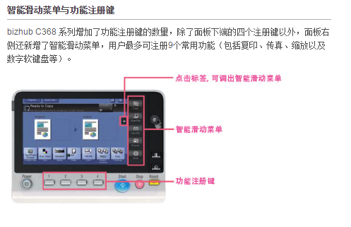 柯美bizhub C368系列打印機致力于滿足全新的辦公風格,即日益興起的移動設備連接和"云"服務對復合機產品提出的要求。除了提高工作效率,該系列產品還為用戶提供強大的彩色輸出和彩色掃描的解決方案以及舒適的辦公環境。